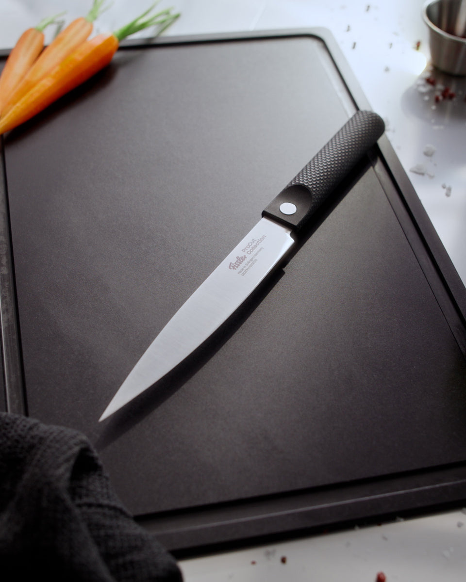 Seit 1845 widmet sich Fissler dem Kochen. Seit 180 Jahren ist es unser Ziel, leidenschaftliche Köche mit Kochgeschirr zu inspirieren und zu begeistern. Jetzt übertragen wir unsere Kompetenz in Design, Ästhetik und Edelstahl in eine neue Produktkategorie. Anlässlich unseres 180. Jubiläums begeistern wir ambitionierte Hobbyköche und absolute Profis mit zwei Messerserien, die für alle Schneidaufgaben das ideale Werkzeug enthalten: Die Fissler ProCut Collection. Gemeinsam mit unserem Partner aus Solingen, dem Herzen der deutschen Messerkunst, bieten wir das richtige Werkzeug für die Vorbereitung. Denn Kochen beginnt nicht erst auf dem Herd. Die Fissler ProCut Collection bietet für alle gängigen Schneidaufgaben das ideale Schneidwerkzeug. Der Fertigungsprozess des Laserschneidverfahrens ermöglicht den Einsatz eines besonders harten Klingenstahls mit 59 HRC. Dadurch kann die Klinge dünner geschliffen werden und wird extrem scharf. Gleichzeitig legen wir größten Wert auf Komfort beim Schneiden: Die Daumenmulde und die Griffstruktur der Fissler ProCut Collection sorgen für die richtige Handhaltung und einen besonders guten Halt, während das geringe Eigengewicht ein ermüdungsfreies Arbeiten ermöglicht. Damit ist die Fissler ProCut Collection ideal für Kochbegeisterte, die sich bei der Zubereitung ihrer Speisen eine ausgewogene Kombination aus besonders lang anhaltender Schärfe und müheloser Handhabung wünschen.